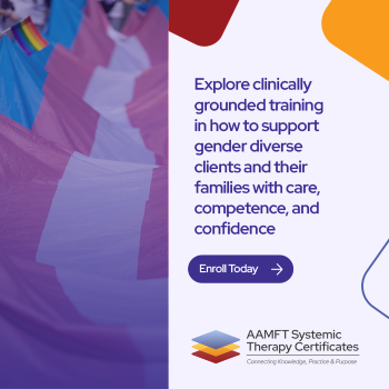 Interested in learning more about how to work with TNBGE clients? Check out AAMFT’s new Systemic Family Therapy Certificate, Foundations of Gender Affirming Care.